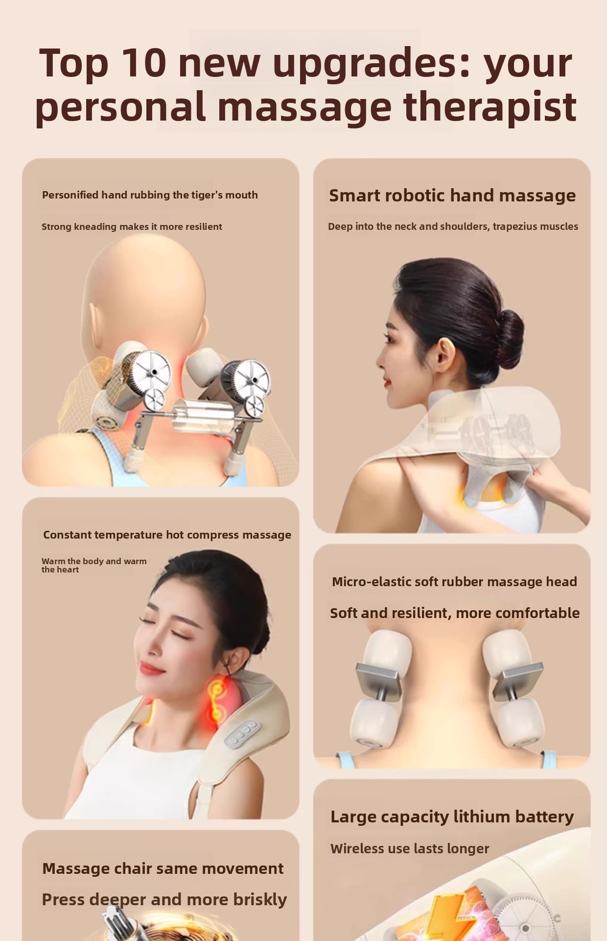 Simulated Hand-Kneading: 6 mechanical heads mimic professional massage techniques